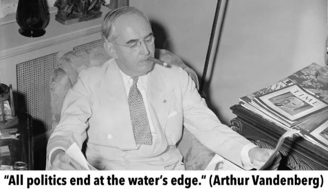 In 1945, Senator Arthur Vandenberg coined his historic post-WWII maxim, "All politics end at the water's edge." According to Vandenberg, as well as general consensus at the time, all partisan politics should cease when our country is engaged in a foreign military conflict. All politicians should unite in solidarity, not only in unanimous support of our troops, but also to present a united front to our foes and to the world. Since Vandenberg made his famous quote, our country has been involved in six major military conflicts-the Korean War, the Vietnam War, the Gulf War, the War on Terror, the War in Afghanistan, and the War in Iraq. In addition, between 1991 and 2022 alone, we've been involved in 251 military interventions, such as President Barack Obama's 2011 military intervention in Libya, in which 26,500 sorties were flown and 7,000 bombings took place over a period of eight months. Now, in none of these major military conflicts or interventions has Congress declared war; in fact, the last time Congress declared war was in 1942, during WWII, when war was declared on Romania.